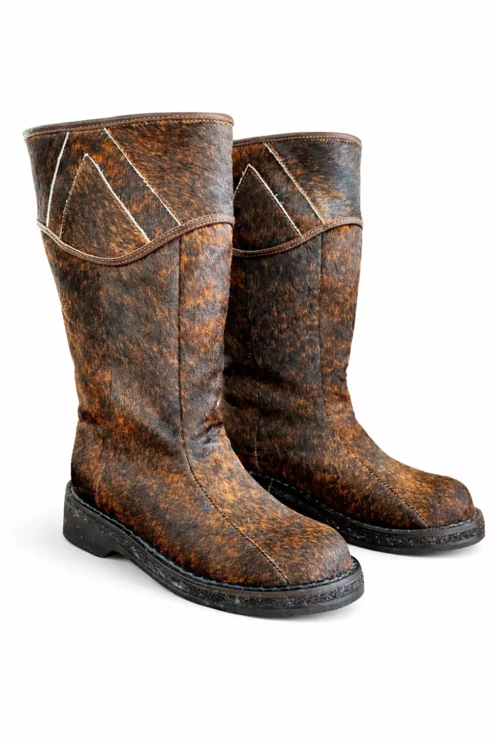 These boots made with cowhide on the outside. Used sheepskin for inside lining. Extra warm for people who work outside. Sole is made of felt, rubber, leather, cowhide, cotton.