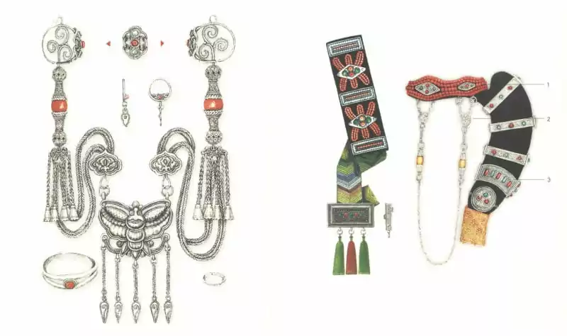 There are several types of clothes, such as festivals, weddings, men and women, children, grandchildren, and elephants. The bayad wife’s robe is usually brown, red, brown, and red, and the inside and outside of the skirt is a two-toed-necked white collar, with sleeves, with sleeves wide, listless, with a solid shoulder and back. The women make their hair shawl (a hairpin) and decorate the upper part of the neck and put on the neck of silver jewelry with a butterfly on the tip. The white collar is a reflection of the holiness by hiding the body of God from heaven.